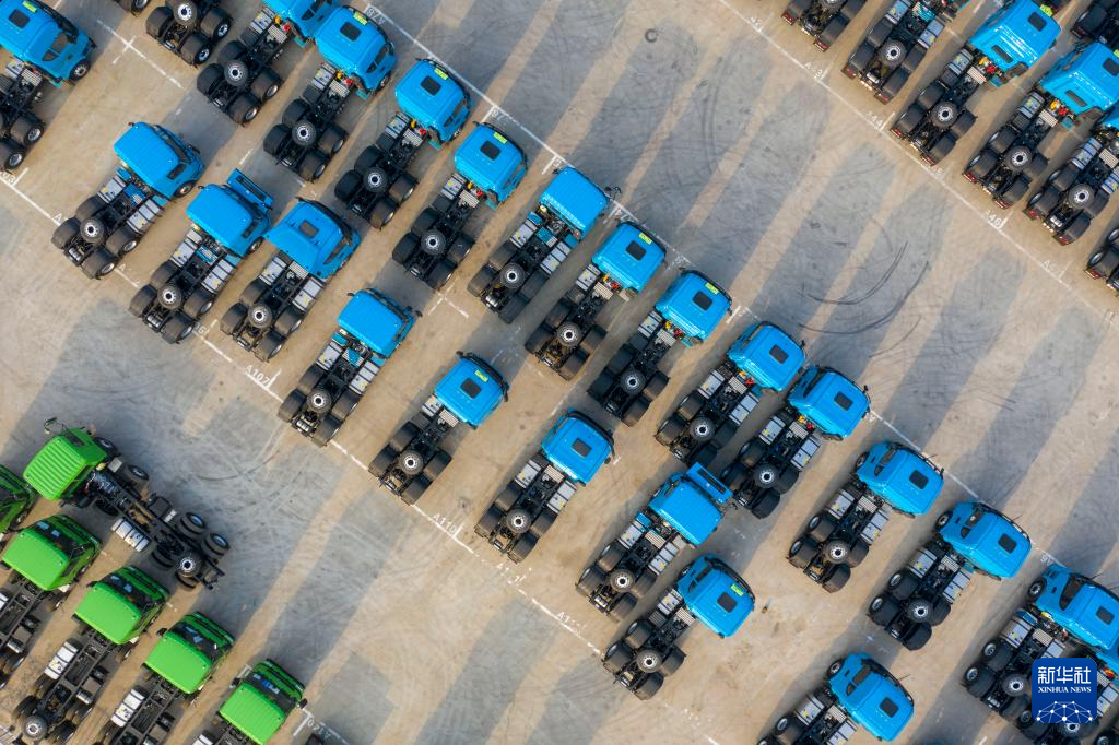 这是4月1日在位于山西省晋中市榆次区的山西新能源汽车工业有限公司(吉利晋中基地)拍摄的甲醇重卡(无人机照片)。