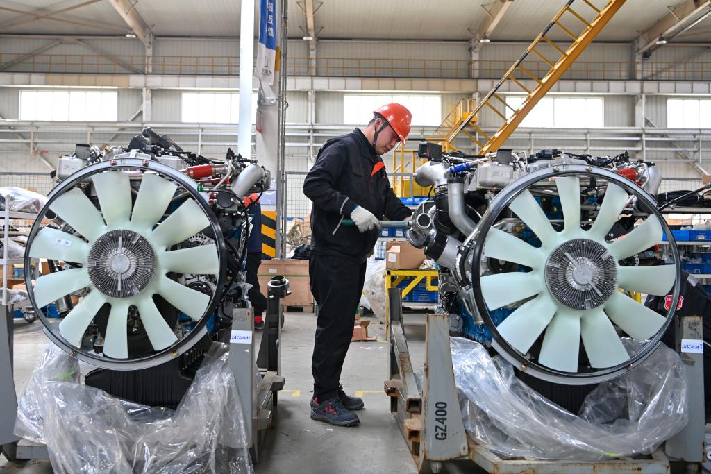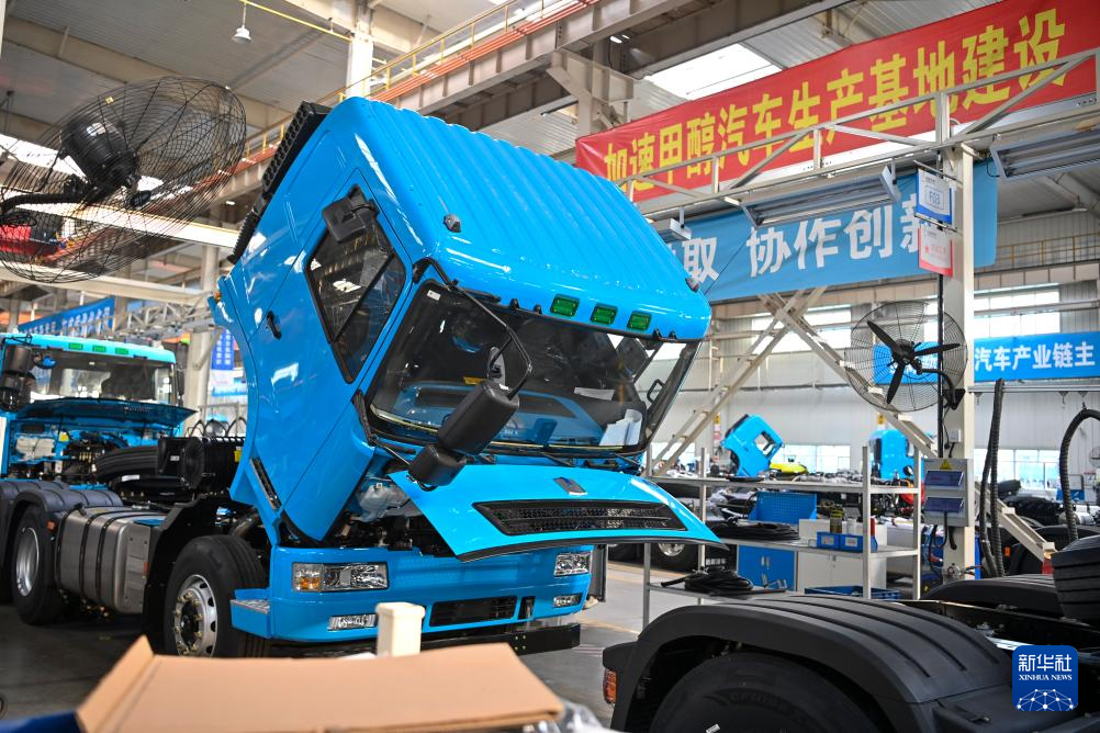 4月1日,工作人员在位于山西省晋中市榆次区的山西新能源汽车工业有限公司(吉利晋中基地)生产甲醇重卡。