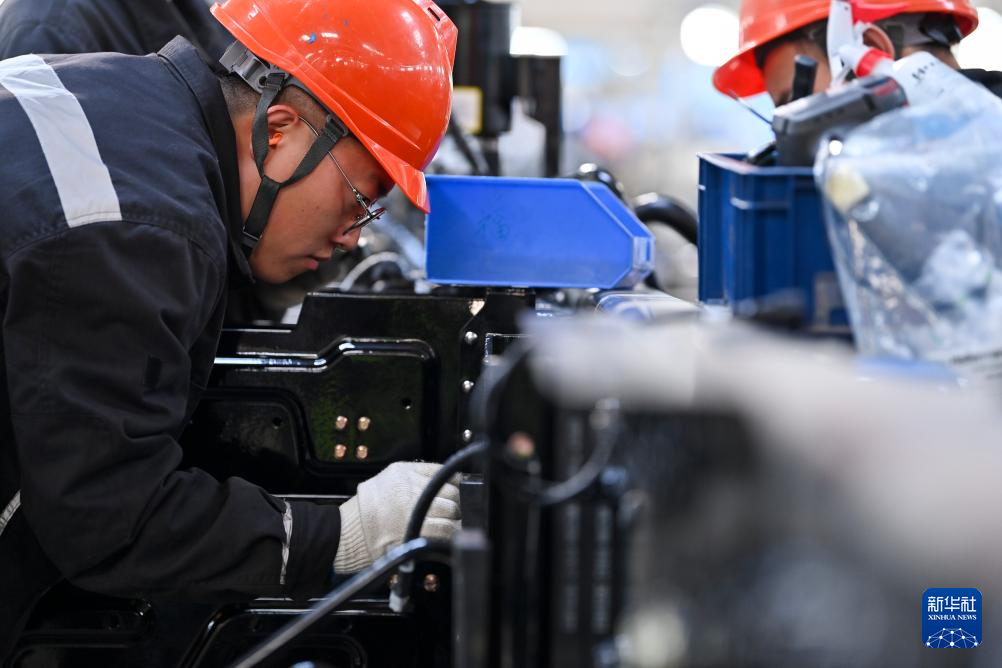 4月1日,工作人员在位于山西省晋中市榆次区的山西新能源汽车工业有限公司(吉利晋中基地)甲醇重卡生产线上作业。