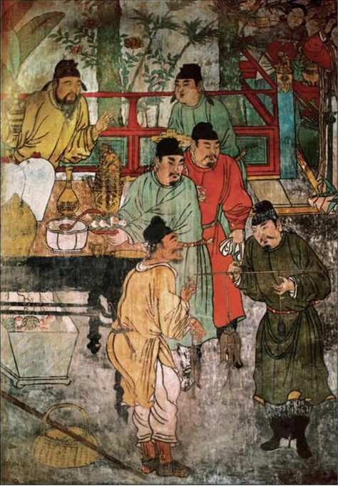 这些壁画中,还有很多有趣的细节值得品味。比如在《下棋图》中,棋盘上有“汉界楚河”之隔,而棋子却类似围棋;在《卖鱼图》中,老渔夫伸出两根手指,强作笑容,而一旁的官员竟在秤杆上做鬼……