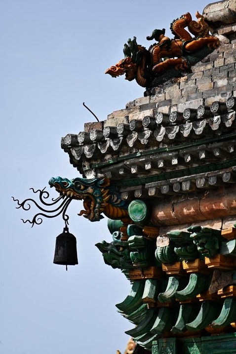进入塔内,被木质回廊遮挡的琉璃现出了真容,近距离欣赏,更能真切感受到造型工艺之精妙。最令人震撼的是塔内的琉璃藻井,琉璃层叠而上,似要通向遥远的天际。最顶层雕有8个龙头,全部指向中心盘旋的第9条龙,呈九龙灌顶之势。
