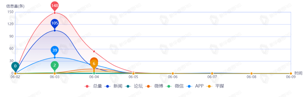 截至目前,該文章在互聯(lián)網(wǎng)上傳播總量206篇。其中6月3日是傳播的高峰期,共傳播148篇文章。各信源的信息發(fā)布情況中,新聞信息占比最大,其次是APP和微博,占比分別為58.74%、29.61%、6.80%。(數(shù)據(jù)來源:新華睿思數(shù)據(jù)云圖分析平臺(tái))