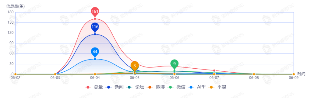 截至目前,該文章在互聯(lián)網(wǎng)上傳播總量230篇。其中6月4日是傳播的高峰期,共傳播161篇文章。各信源的信息發(fā)布情況中,新聞信息占比最大,其次是APP和微信,占比分別為61.30%、23.48%、10.00%(數(shù)據(jù)來源:新華睿思數(shù)據(jù)云圖分析平臺(tái))