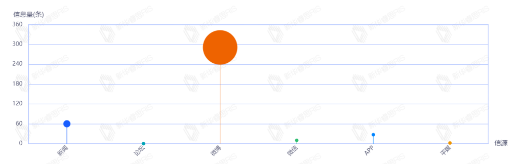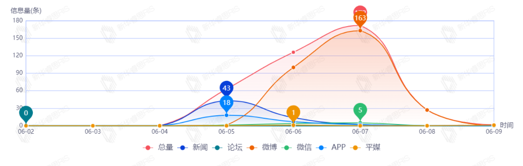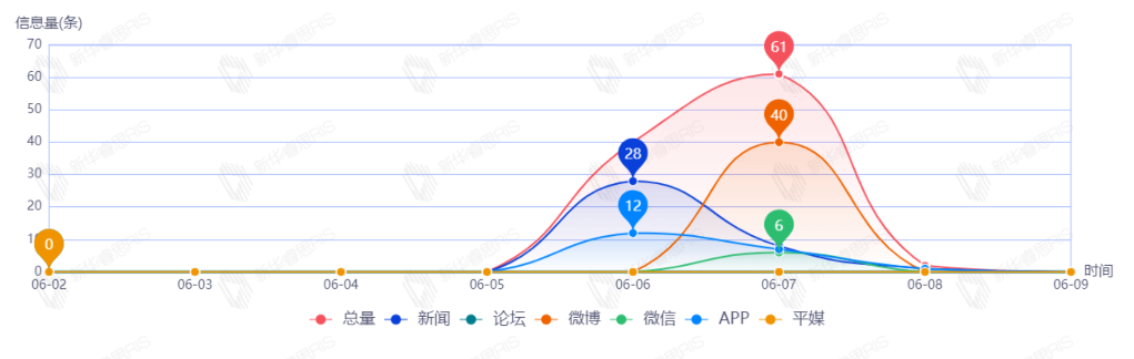 截至目前,該文章在互聯(lián)網(wǎng)上傳播總量103篇。其中6月7日是傳播的高峰期,共傳播61篇文章。各信源的信息發(fā)布情況中,微博信息占比最大,其次是新聞和APP,占比分別為38.83%、35.92%、19.42%。(數(shù)據(jù)來源:新華睿思數(shù)據(jù)云圖分析平臺(tái))