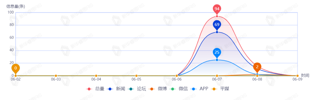 截至目前,該文章在互聯(lián)網(wǎng)上傳播總量109篇。其中6月7日是傳播的高峰期,共傳播94篇文章。各信源的信息發(fā)布情況中,新聞信息占比最大,其次是APP和微博,占比分別為73.39%、24.77%、1.83%。(數(shù)據(jù)來源:新華睿思數(shù)據(jù)云圖分析平臺(tái))