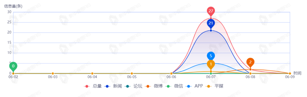截至目前,該文章在互聯(lián)網(wǎng)上傳播總量29篇。其中6月7日是傳播的高峰期,共傳播27篇文章。各信源的信息發(fā)布情況中,新聞信息占比最大,其次是APP和微博,占比分別為72.41%、17.24%、6.90%。(數(shù)據(jù)來源:新華睿思數(shù)據(jù)云圖分析平臺(tái))