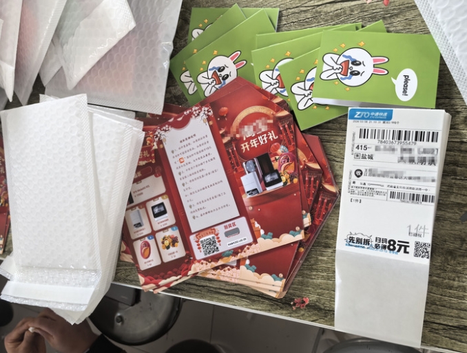 去年12月,太原市的李女士收到一个陌生快递,里面除了一个小的记事本外,还有两张小卡片,一张是某电商平台的宣传页,另一张是刮奖卡片。卡片上宣称为回馈老用户特举行抽奖活动,奖品从手机、扫地机器人、洗碗机、暖手宝,到一份当季水果不等。