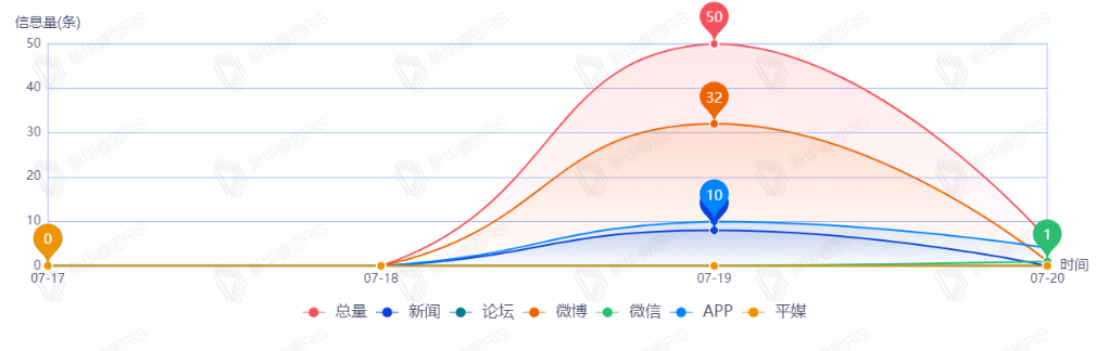 截至目前,該文章在互聯(lián)網(wǎng)上傳播總量56篇。其中7月19日是傳播的高峰期,共傳播50篇文章。各信源的信息發(fā)布情況中,微博占比最大,其次是APP和新聞,占比分別為58.93%、25.00%、14.29%。(數(shù)據(jù)來(lái)源:新華睿思數(shù)據(jù)云圖分析平臺(tái))