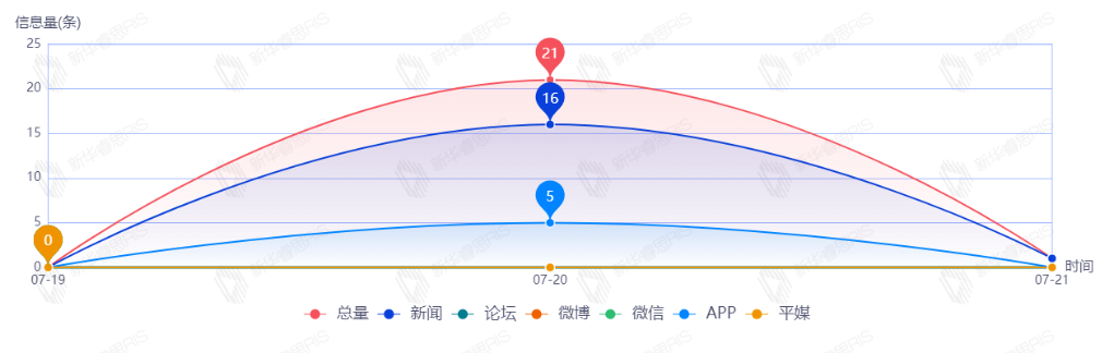 截至目前,該文章在互聯(lián)網(wǎng)上傳播總量22篇。其中7月20日是傳播的高峰期,共傳播21篇文章。各信源的信息發(fā)布情況中,新聞信息占比最大,其次是APP,占比分別為77.27%和22.73%。(數(shù)據(jù)來(lái)源:新華睿思數(shù)據(jù)云圖分析平臺(tái))