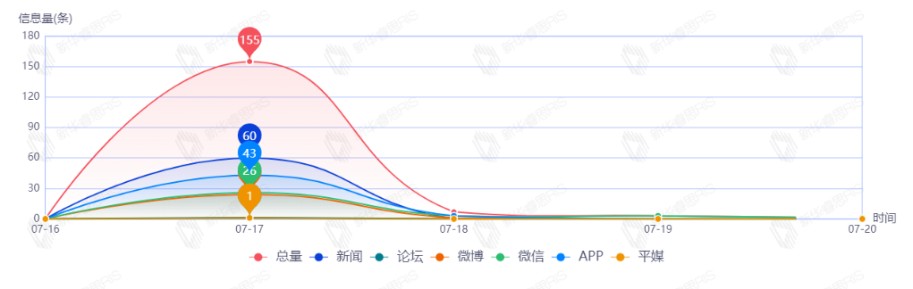 截至目前,該文章在互聯(lián)網(wǎng)上傳播總量166篇。其中7月17日是傳播的高峰期,共傳播155篇文章。各信源的信息發(fā)布情況中,新聞信息占比最大,其次是APP和微信,占比分別為36.14%、27.71%、19.88%。(數(shù)據(jù)來(lái)源:新華睿思數(shù)據(jù)云圖分析平臺(tái))