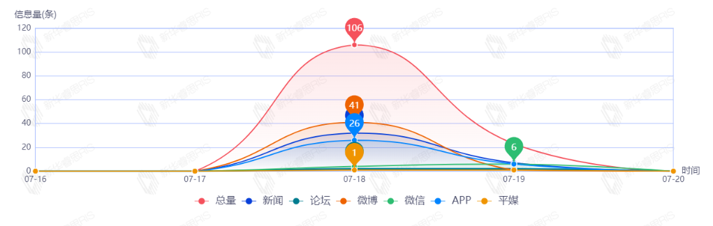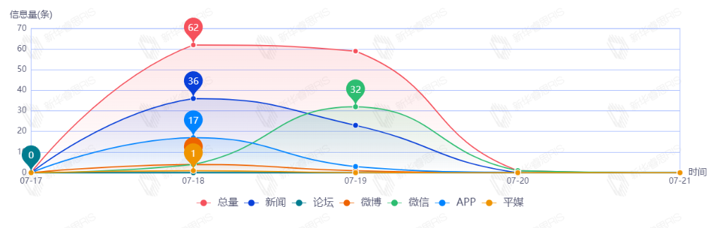 截至目前,該文章在互聯(lián)網(wǎng)上傳播總量122篇。其中7月18日是傳播的高峰期,共傳播62篇文章。各信源的信息發(fā)布情況中,新聞信息占比最大,其次是微信和APP,占比分別為48.36%、30.33%、16.39%。(數(shù)據(jù)來(lái)源:新華睿思數(shù)據(jù)云圖分析平臺(tái))