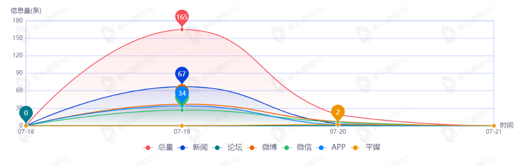 截至目前,該文章在互聯(lián)網(wǎng)上傳播總量184篇。其中7月19日是傳播的高峰期,共傳播165篇文章。各信源的信息發(fā)布情況中,新聞信息占比最大,其次是微博和APP,占比分別為38.04%、23.91%、19.02%。(數(shù)據(jù)來(lái)源:新華睿思數(shù)據(jù)云圖分析平臺(tái))