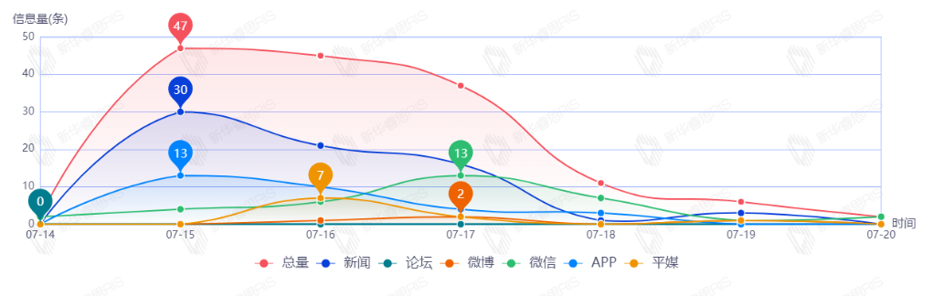 截至目前,該文章在互聯(lián)網(wǎng)上傳播總量150篇。其中7月15日是傳播的高峰期,共傳播47篇文章。各信源的信息發(fā)布情況中,新聞信息占比最大,其次是微信和APP,占比分別為47.33%、23.33%、20.00%。(數(shù)據(jù)來(lái)源:新華睿思數(shù)據(jù)云圖分析平臺(tái))