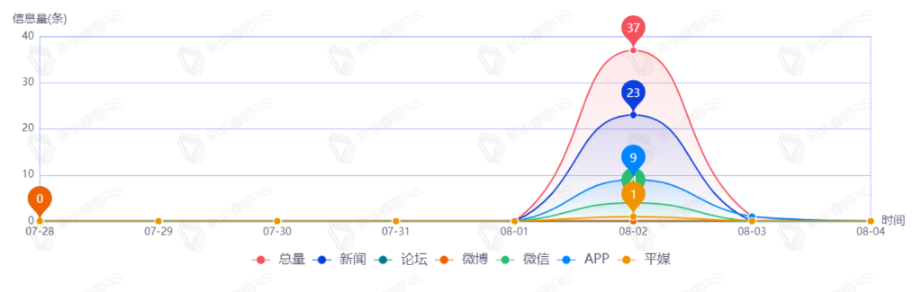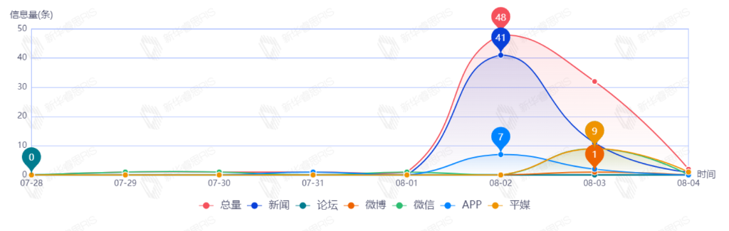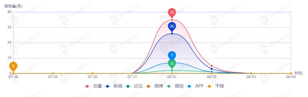 截至目前,該文章在互聯(lián)網(wǎng)上傳播總量40篇。其中8月1日是傳播的高峰期,共傳播35篇文章。各信源的信息發(fā)布情況中,新聞信息占比最大,其次是APP和微信,占比分別為72.50%、20.00%、7.50%。(數(shù)據(jù)來源:新華睿思數(shù)據(jù)云圖分析平臺)