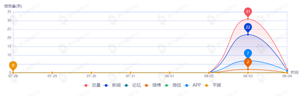 截至目前,該文章在互聯(lián)網(wǎng)上傳播總量33篇。其中8月3日是傳播的高峰期,共傳播31篇文章。各信源的信息發(fā)布情況中,新聞信息占比最大,其次是APP和微博,占比分別為69.70%、24.24%、6.06%。(數(shù)據(jù)來源:新華睿思數(shù)據(jù)云圖分析平臺)