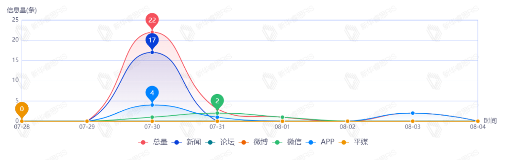 截至目前,該文章在互聯(lián)網(wǎng)上傳播總量28篇。其中7月30日是傳播的高峰期,共傳播22篇文章。各信源的信息發(fā)布情況中,新聞信息占比最大,其次是APP和微信,占比分別為60.71%、25.00%、14.29%。(數(shù)據(jù)來源:新華睿思數(shù)據(jù)云圖分析平臺)
