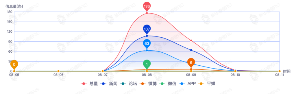 截至目前,該文章在互聯(lián)網(wǎng)上傳播總量272篇。其中8月8日是傳播的高峰期,共傳播176篇文章。各信源的信息發(fā)布情況中,新聞信息占比最大,其次是APP和微博,信息量分別為173、87、11,占比分別為63.60%、31.99%、4.04%。(數(shù)據(jù)來(lái)源:新華睿思數(shù)據(jù)云圖分析平臺(tái))