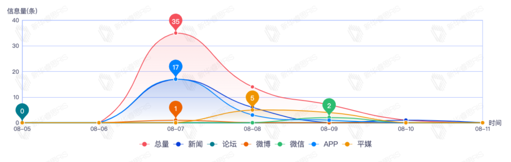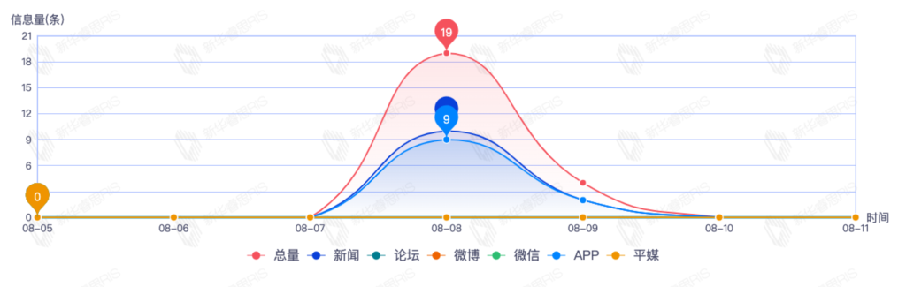 截至目前,該文章在互聯(lián)網(wǎng)上傳播總量23篇。其中8月8日是傳播的高峰期,共傳播19篇文章。各信源的信息發(fā)布情況中,聞信息占比最大,其次是APP,信息量分別為12、11,占比分別為52.17%、47.83%。(數(shù)據(jù)來(lái)源:新華睿思數(shù)據(jù)云圖分析平臺(tái))