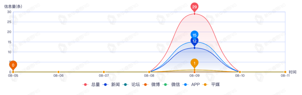 截至目前,該文章在互聯(lián)網(wǎng)上傳播總量29篇。其中8月9日是傳播的高峰期,共傳播29篇文章。各信源的信息發(fā)布情況中,APP信息占比最大,其次是新聞和平媒,信息量分別為15、12、1,占比分別為51.72%、41.38%、3.45%。(數(shù)據(jù)來(lái)源:新華睿思數(shù)據(jù)云圖分析平臺(tái))