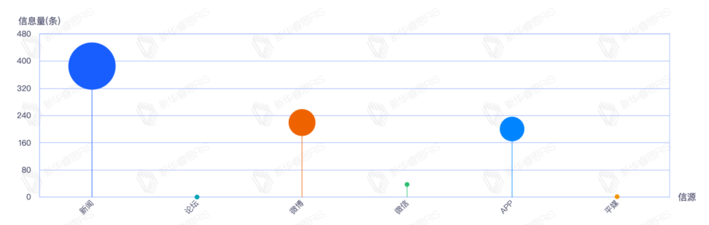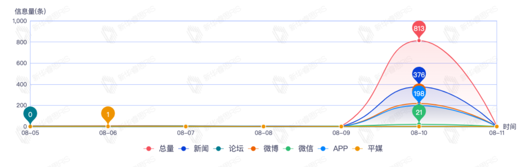 截至目前,該文章在互聯(lián)網(wǎng)上傳播總量842篇。其中8月10日是傳播的高峰期,共傳播813篇文章。各信源的信息發(fā)布情況中,新聞信息占比最大,其次是微博和APP,信息量分別為385、219、200,占比分別為45.72%、26.01%、23.75%。(數(shù)據(jù)來(lái)源:新華睿思數(shù)據(jù)云圖分析平臺(tái))