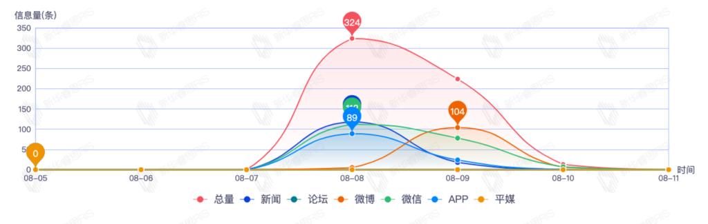 截至目前,該文章在互聯(lián)網(wǎng)上傳播總量561篇。其中8月8日是傳播的高峰期,共傳播324篇文章。各信源的信息發(fā)布情況中,微信信息占比最大,其次是新聞和微博,信息量分別為197、136、115,占比分別為35.12%、24.24%、20.50%。(數(shù)據(jù)來(lái)源:新華睿思數(shù)據(jù)云圖分析平臺(tái))