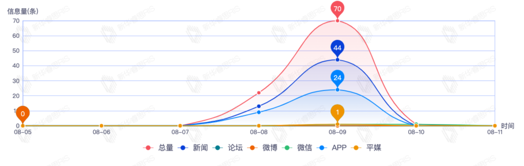 截至目前,該文章在互聯(lián)網(wǎng)上傳播總量93篇。其中8月9日是傳播的高峰期,共傳播70篇文章。各信源的信息發(fā)布情況中,新聞信息占比最大,其次是APP和微信,信息量分別為57、33、2,占比分別為61.29%、35.48%、2.15%。(數(shù)據(jù)來(lái)源:新華睿思數(shù)據(jù)云圖分析平臺(tái))