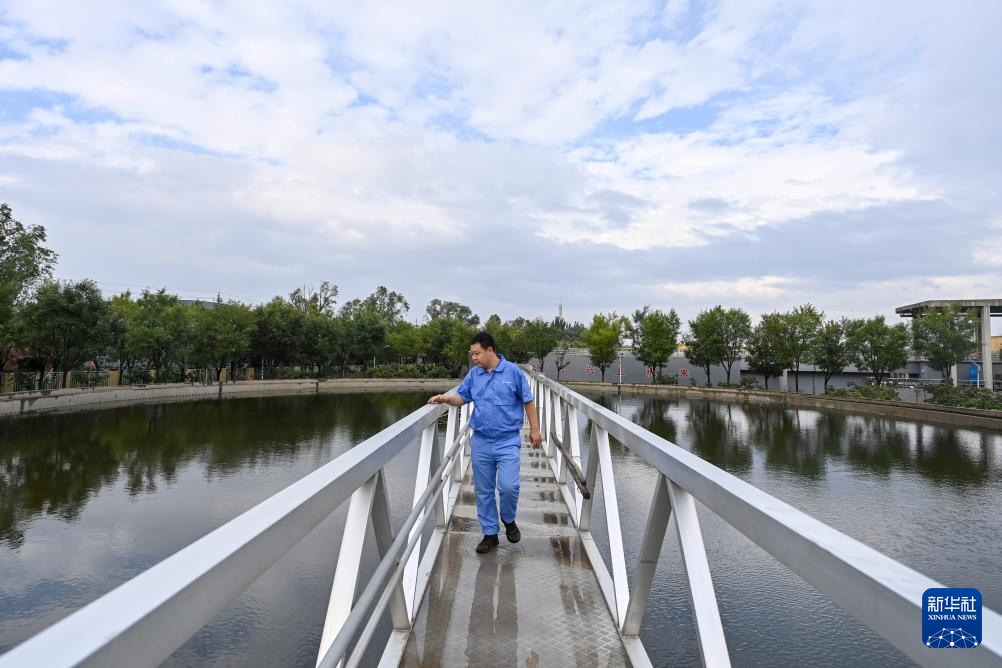 工作人员在位于太原市小店区的汾东污水处理厂查看污水处理情况(8月7日摄)。