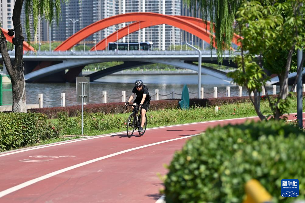 市民在太原滨河自行车道骑行(8月6日摄)。