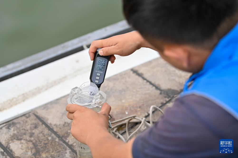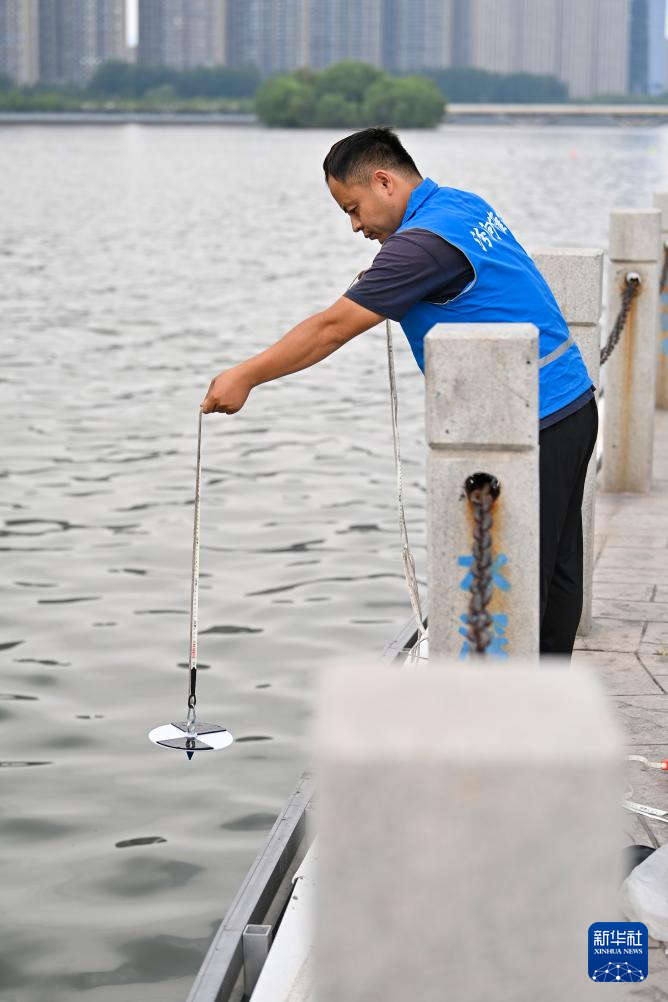 工作人员在汾河太原段检测水质(7月3日摄)。