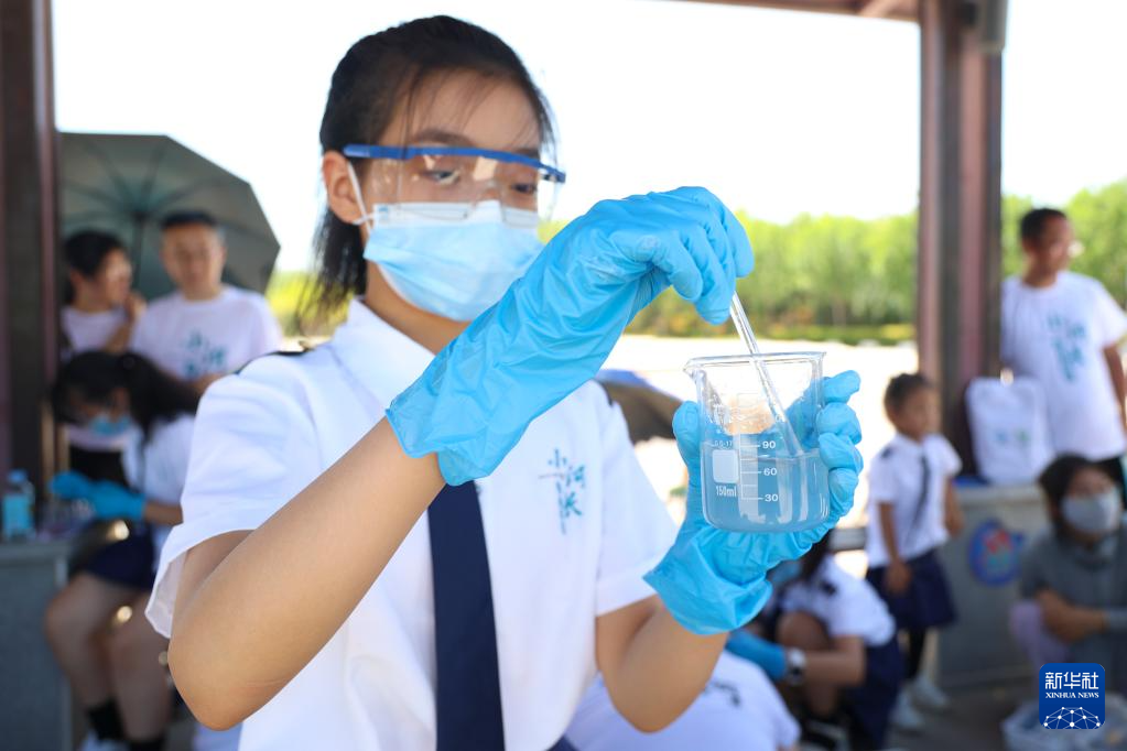 小朋友在一场环保教育活动上体验检测汾河水质(7月20日摄)。