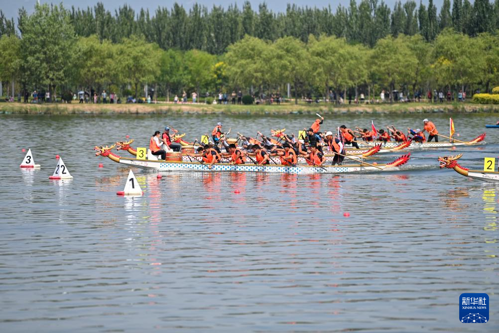 参赛队伍在2024太原汾河龙舟公开赛上竞渡(6月10日摄)。