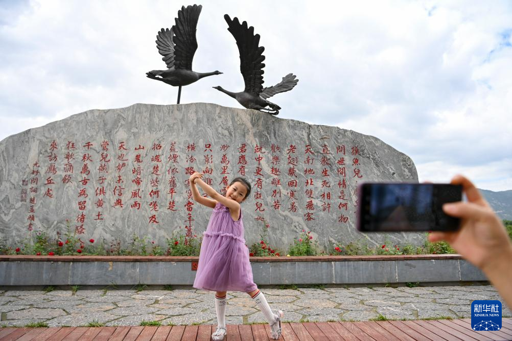 小朋友在位于太原汾河畔的雁丘园拍照(8月10日摄)。