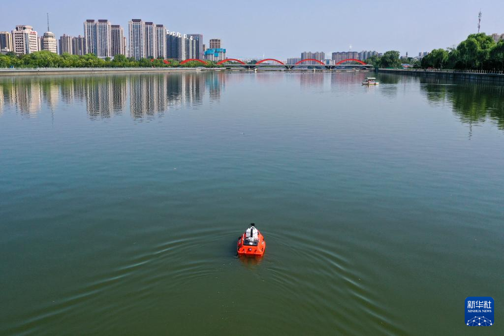 无人船在汾河太原段作业(8月6日摄,无人机照片)。该设备可通过自主导航、智能避障、远距离通信、实时传输数据等功能,实时掌握汾河水质状况及水质变化规律,为流域生态环境治理提供技术支撑。
