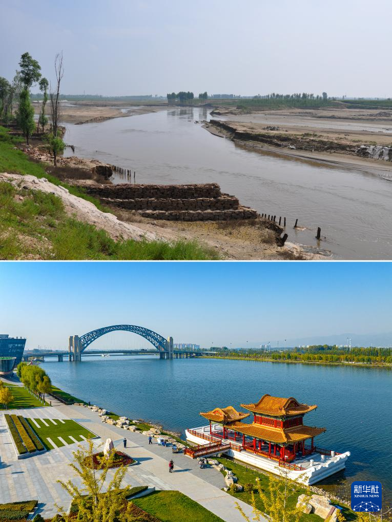 这是汾河太原段三期工程旧貌新颜对比(拼版照片)。