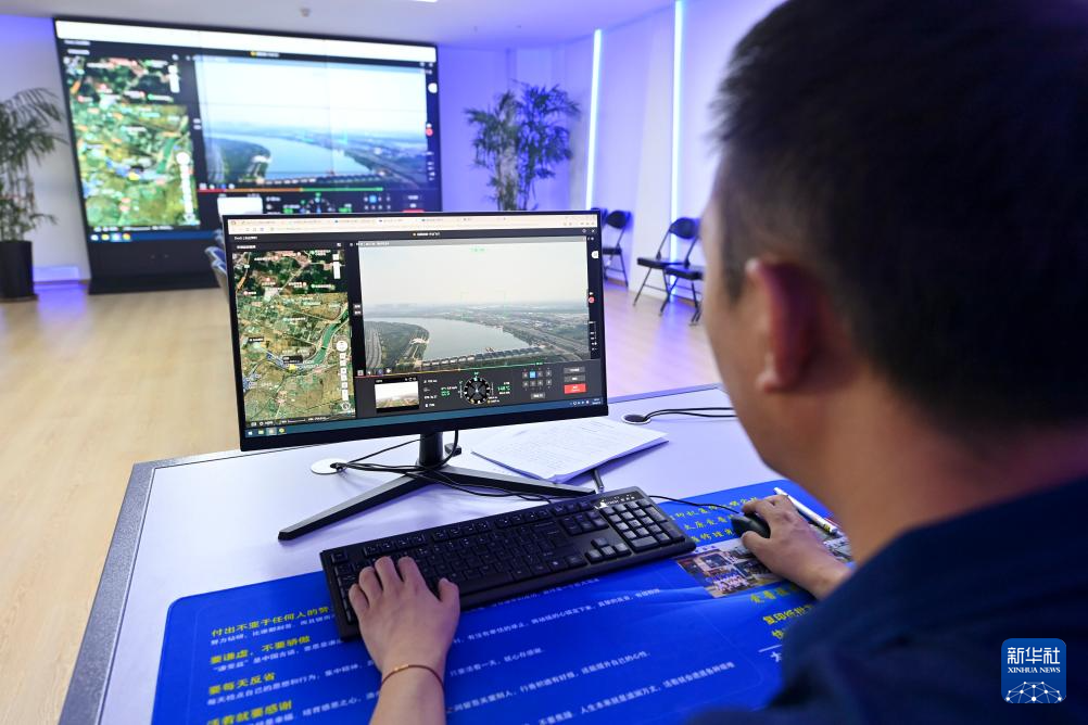 在位于太原市杏花岭区的一家检测机构,工作人员通过总控台查看无人机实时监测数据(7月4日摄)。2023年,为实时监测河道水质,太原市沿汾河设置了11座无人机水环境监测站。