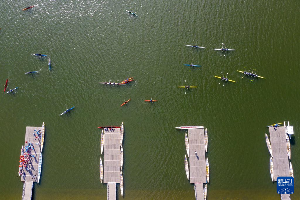 运动队在太原市水上运动中心训练(6月7日摄,无人机照片)。