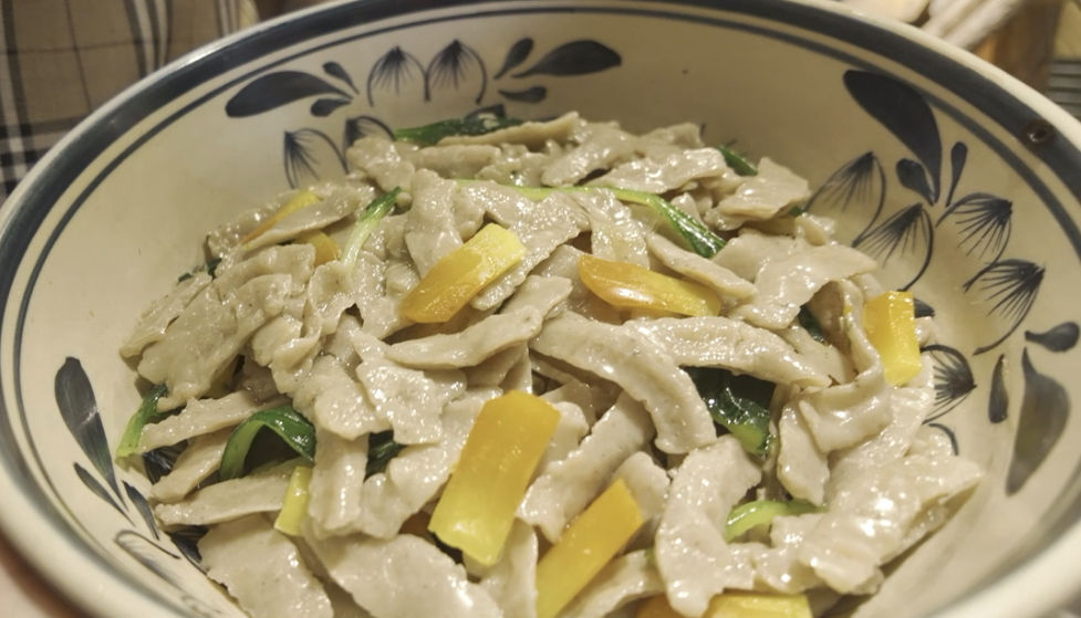当然,最好用的工具当属做面的“魔法棒”——手指。用手指将莜面的小面团搓成橄榄形,上锅一蒸,就成了“莜面鱼鱼”;将面团放在砧板上,用手掌后部往前推压成薄片,就成了“栲栳栳”;将面团分切成小面丁以后,用大拇指一抿,就成了“猫耳朵”;将小麦面加一两种杂粮面混匀后和成较软的面团,匀速将面挤压出手指缝,就成了“握流流”。在“魔法棒”的作用下,面团变成了各式各样的美餐,给山西人带来了无尽舌尖上的享受。