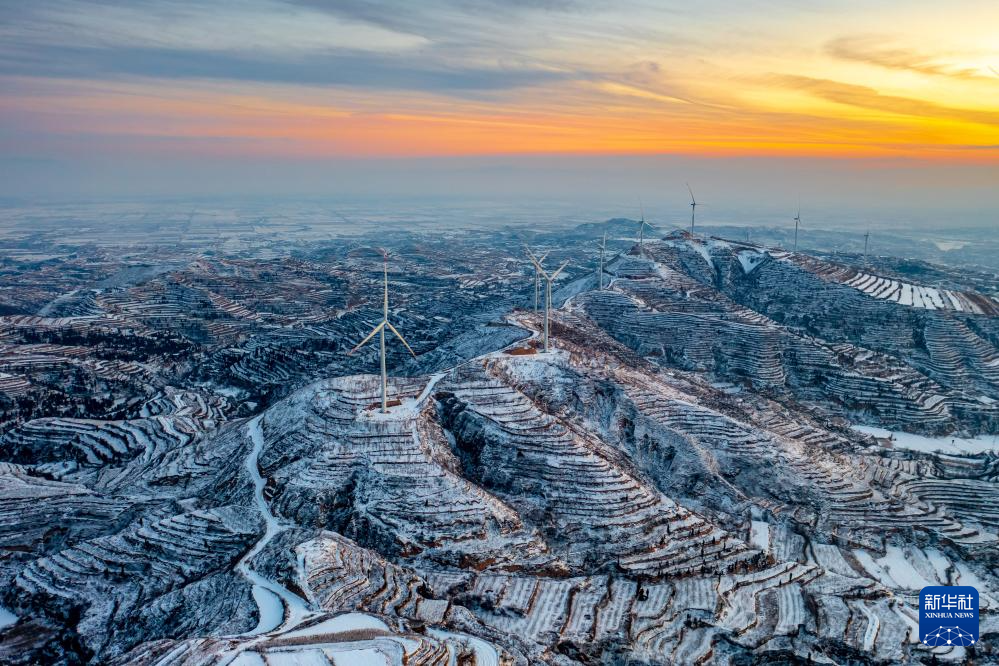 这是在山西省运城市万荣县境内拍摄的风力发电机组(2024年1月24日摄,无人机照片)。新华社发(闫鑫 摄)