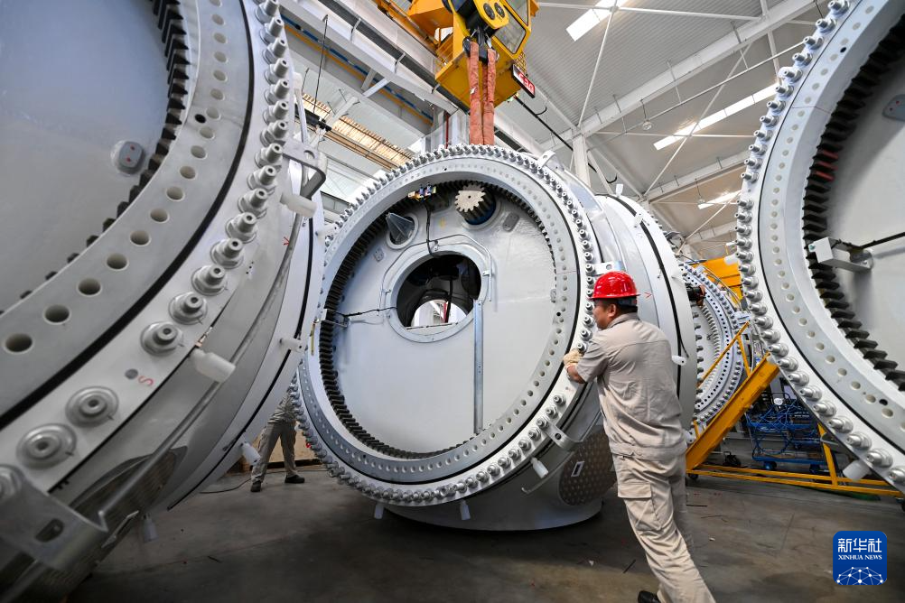 工人在位于山西转型综合改革示范区的太重集团新能源产业园区吊运风电装备(2024年5月30日摄)。新华社记者 杨晨光 摄