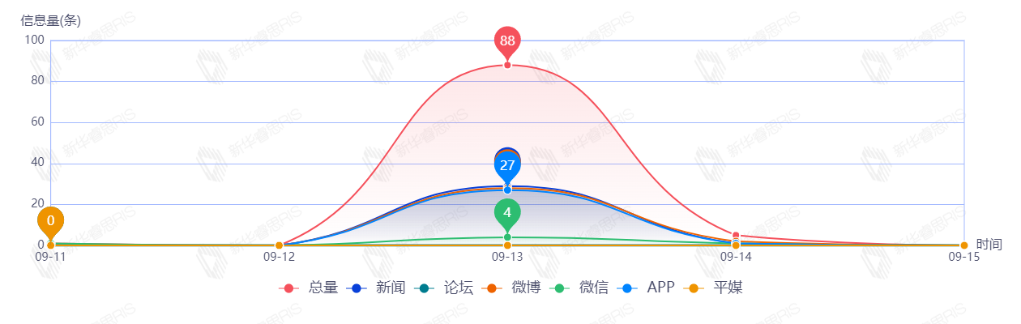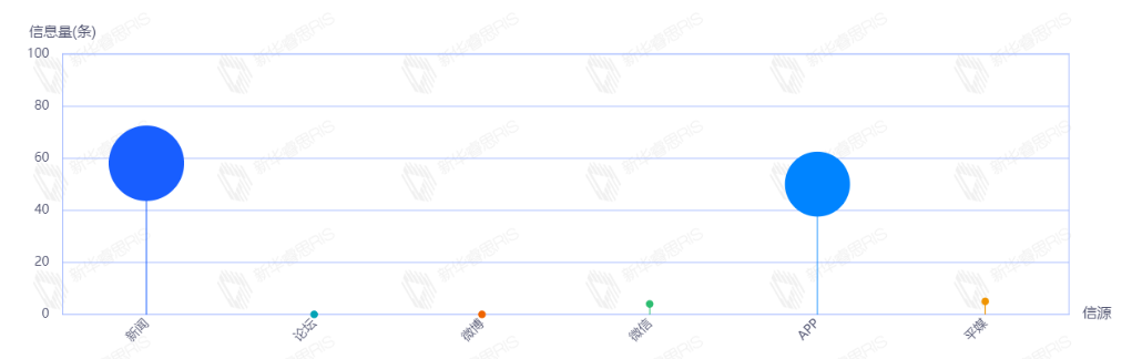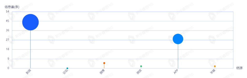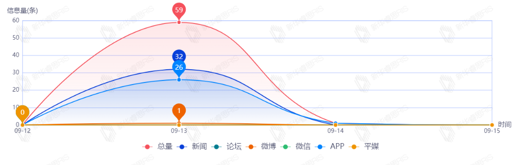截至目前,該文章在互聯(lián)網(wǎng)上傳播總量60篇。其中9月13日是傳播的高峰期,共傳播59篇文章。各信源的信息發(fā)布情況中,新聞信息占比最大,其次是APP,占比分別為53.33%和45.00%。(數(shù)據(jù)來(lái)源:新華睿思數(shù)據(jù)云圖分析平臺(tái))