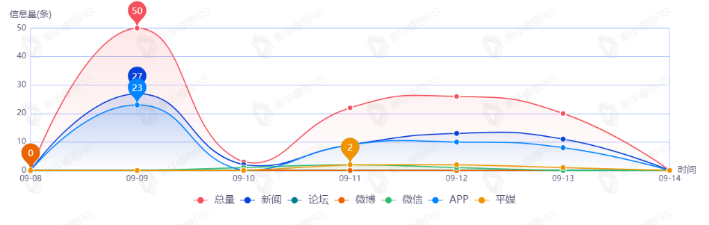 截至目前,該文章在互聯(lián)網(wǎng)上傳播總量121篇。其中9月9日是傳播的高峰期,共傳播50篇文章。各信源的信息發(fā)布情況中,新聞信息占比最大,其次是APP,占比分別為49.57%和42.74%。(數(shù)據(jù)來(lái)源:新華睿思數(shù)據(jù)云圖分析平臺(tái))