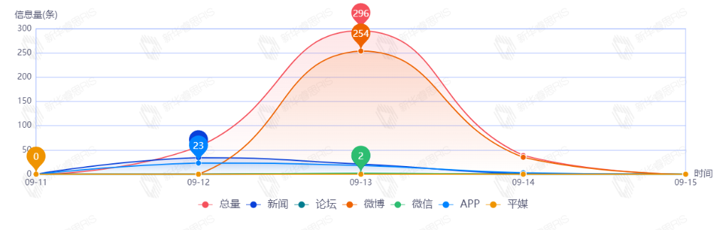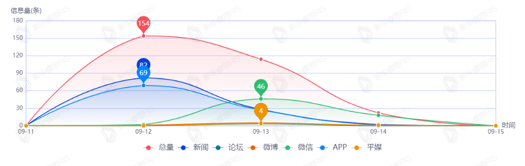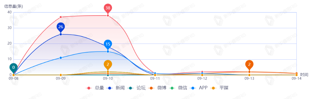 截至目前,該文章在互聯(lián)網(wǎng)上傳播總量290篇。其中9月12日是傳播的高峰期,共傳播154篇文章。各信源的信息發(fā)布情況中,新聞信息占比最大,其次是APP,占比分別為38.62%和33.45%。(數(shù)據(jù)來(lái)源:新華睿思數(shù)據(jù)云圖分析平臺(tái))