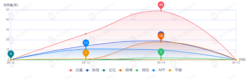 截至目前,該文章在互聯(lián)網(wǎng)上傳播總量75篇。其中9月14日是傳播的高峰期,共傳播49篇文章。各信源的信息發(fā)布情況中,新聞信息占比最大,其次是APP,占比分別為44.00%和28.00%。(數(shù)據(jù)來(lái)源:新華睿思數(shù)據(jù)云圖分析平臺(tái))