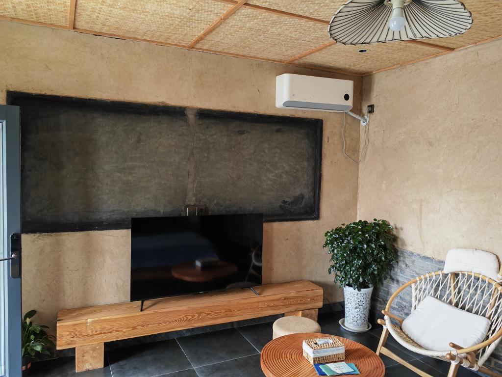院子里饱经岁月的红砖墙上还写着“教育为本”的标语,小院里有四五间民宿,房间里带着回忆的茅草墙和一块硕大的黑板,让整个房子多了一层情感的温暖。几位游客正在院里的大树下说说笑笑,回忆着儿时的乡村时光……