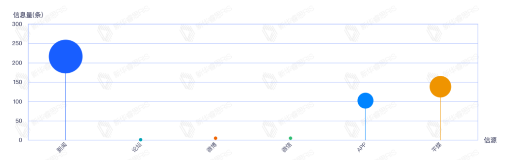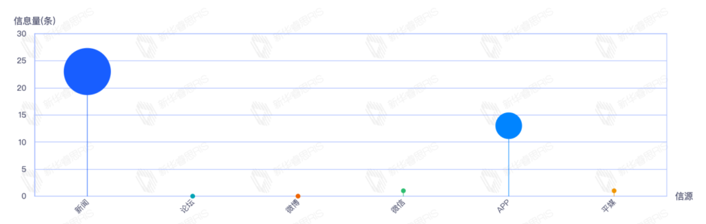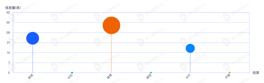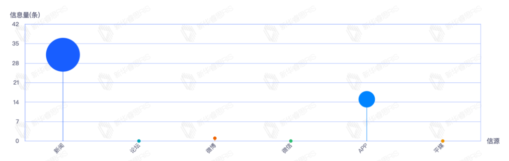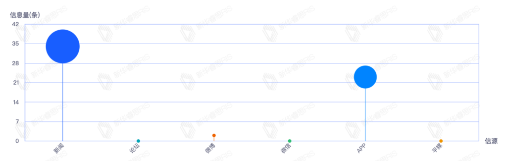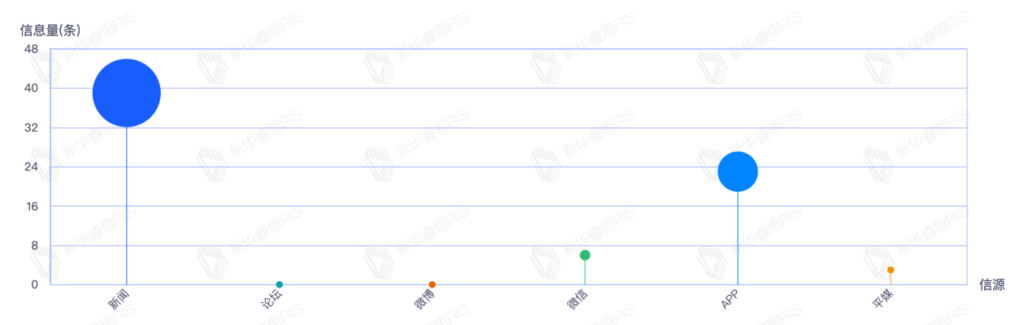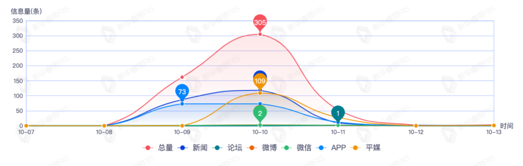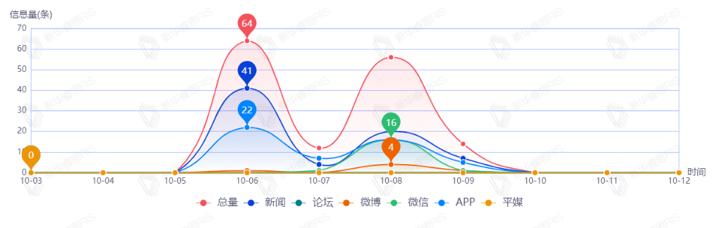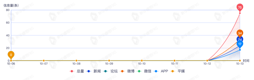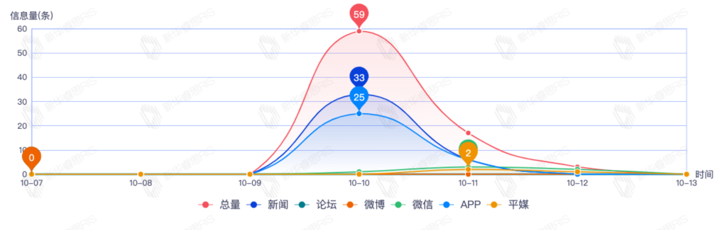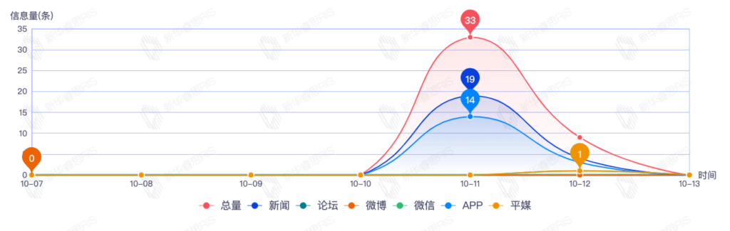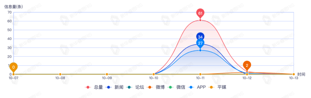 截至目前,該文章在互聯(lián)網(wǎng)上傳播總量64篇。其中10月11日是傳播的高峰期,共傳播61篇文章。各信源的信息發(fā)布情況中,新聞信息占比最大,其次是APP和微博,信息量分別為34、23、2,占比分別為57.63%、38.98%、3.39%。(數(shù)據(jù)來源:新華睿思數(shù)據(jù)云圖分析平臺)