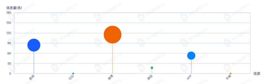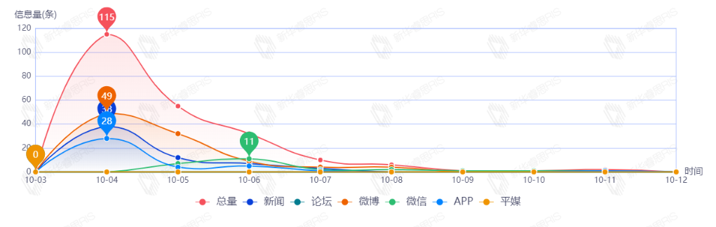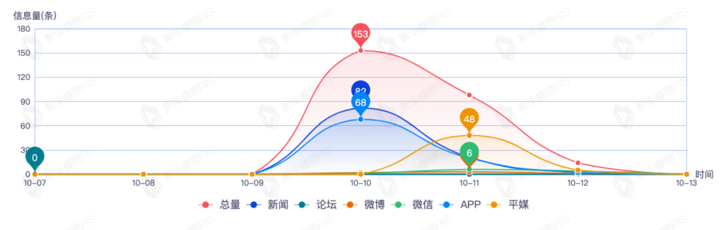 截至目前,該文章在互聯(lián)網(wǎng)上傳播總量283篇。其中10月11日是傳播的高峰期,共傳播134篇文章。各信源的信息發(fā)布情況中,微博信息占比最大,其次是新聞和APP,信息量分別為115、84、53,占比分別為42.75%、31.23%、19.70%。(數(shù)據(jù)來源:新華睿思數(shù)據(jù)云圖分析平臺)