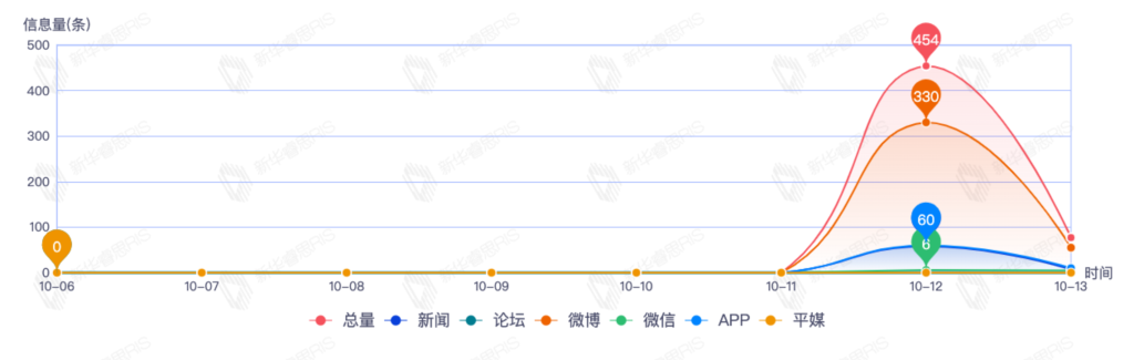 截至目前,該文章在互聯(lián)網(wǎng)上傳播總量531篇。其中10月12日是傳播的高峰期,共傳播454篇文章。各信源的信息發(fā)布情況中,微博信息占比最大,其次是新聞和APP,信息量分別為384、65、56,占比分別為74.42%、12.60%、10.85%。(數(shù)據(jù)來源:新華睿思數(shù)據(jù)云圖分析平臺)