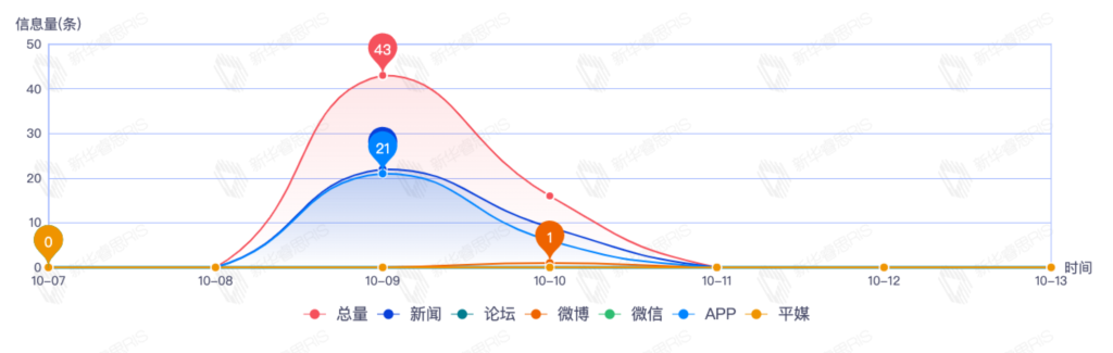 截至目前,該文章在互聯(lián)網(wǎng)上傳播總量42篇。其中10月11日是傳播的高峰期,共傳播33篇文章。各信源的信息發(fā)布情況中,新聞信息占比最大,其次是APP和平媒,信息量分別為23、13、1,占比分別為60.53%、34.21%、2.63%。(數(shù)據(jù)來源:新華睿思數(shù)據(jù)云圖分析平臺)