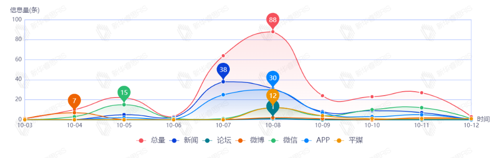 截至目前,該文章在互聯(lián)網(wǎng)上傳播總量265篇。其中10月8日是傳播的高峰期,共傳播88篇文章。各信源的信息發(fā)布情況中,新聞信息占比最大,其次是微信和APP,信息量分別為100、59、50,占比分別為41.15%、24.28%、20.58%。(數(shù)據(jù)來源:新華睿思數(shù)據(jù)云圖分析平臺)