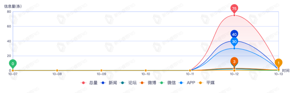 截至目前,該文章在互聯(lián)網(wǎng)上傳播總量78篇。其中10月12日是傳播的高峰期,共傳播75篇文章。各信源的信息發(fā)布情況中,新聞信息占比最大,其次是APP和微博,信息量分別為41、24、3,占比分別為57.75%、33.80%、4.23%。(數(shù)據(jù)來源:新華睿思數(shù)據(jù)云圖分析平臺)